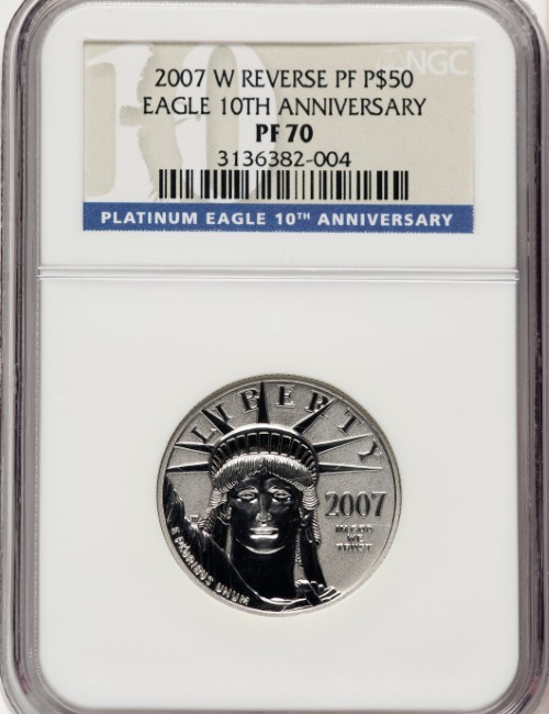【ファーストストライク】アメリカ 50ドル 1/2オンス プラチナイーグル 10周年記念リバース・プルーフ 2007-W年 NGC-PR70