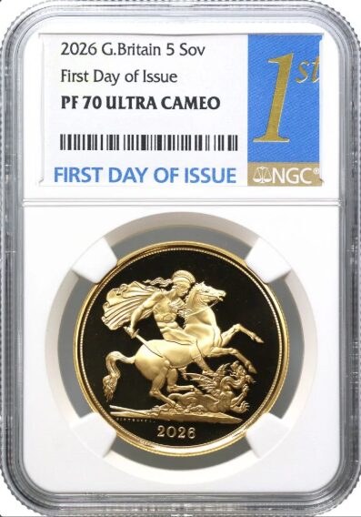 裏面には、1817年の近代ソブリン誕生以来、英国金貨の象徴として君臨し続けているベネデット・ピストルッチの最高傑作が採用されている。